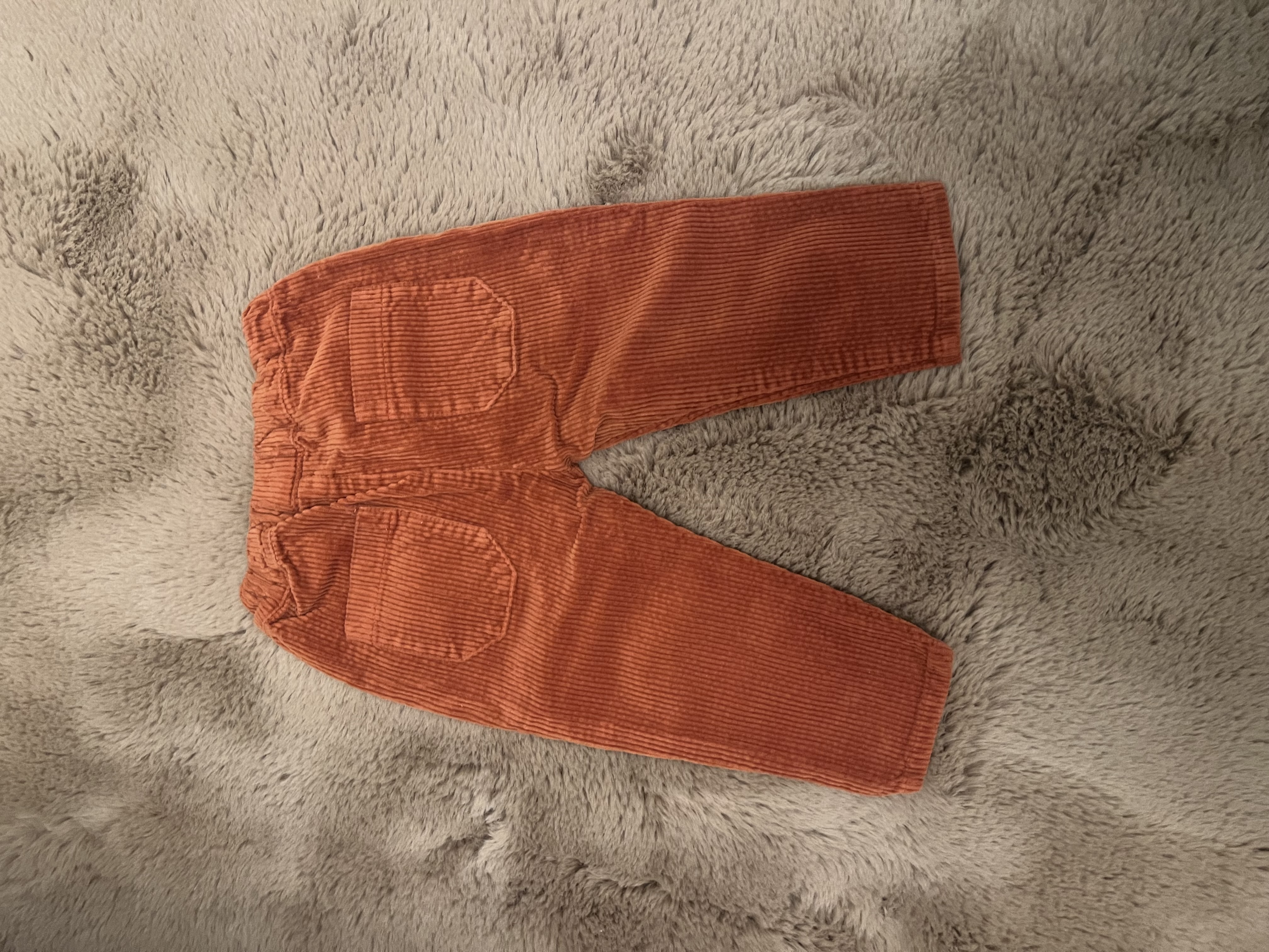 Un bragotto in velluto a costine per bambino di 12 mesi, in un elegante arancione mattone. Il modello presenta vita elasticizzata per garantire comfort e libertà di movimento, con due bottoni estetici sul davanti. Il taglio è caratterizzato da un cavallo basso, per un look morbido e contemporaneo.