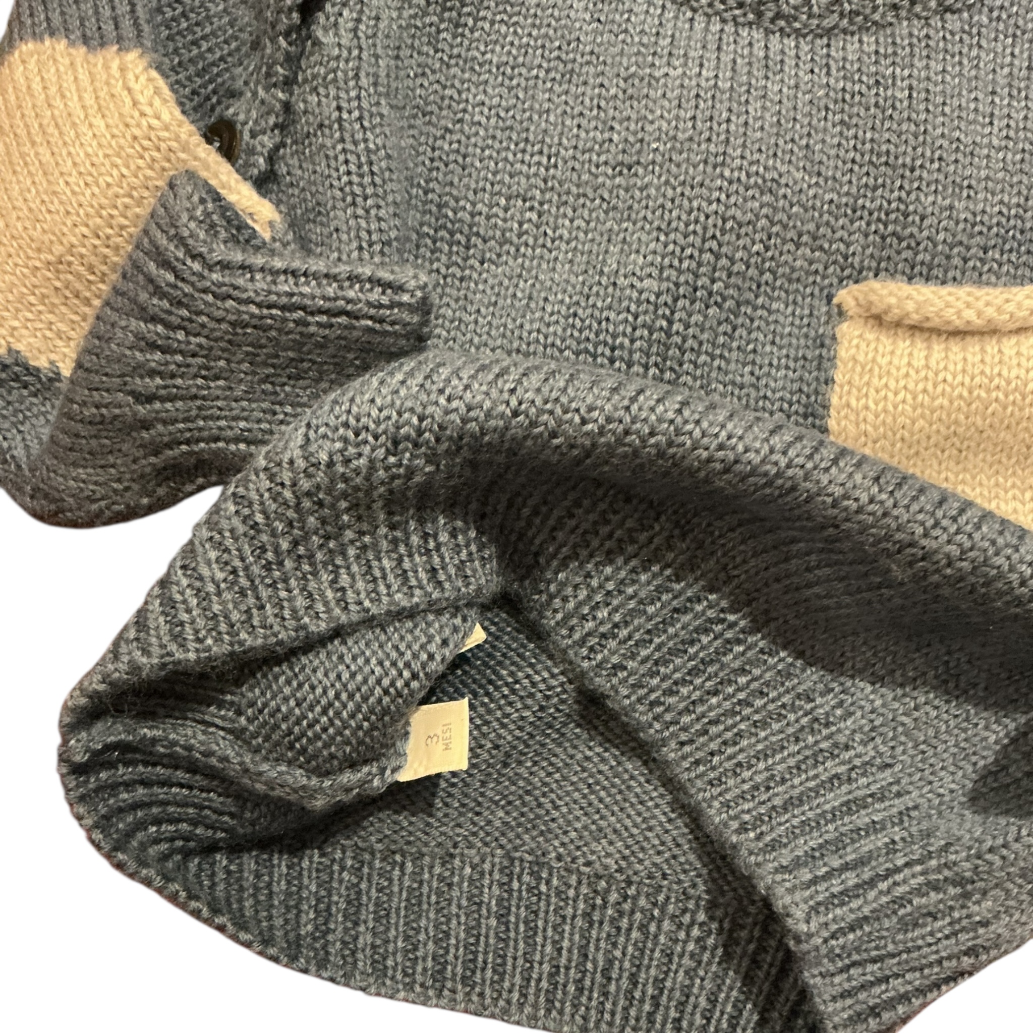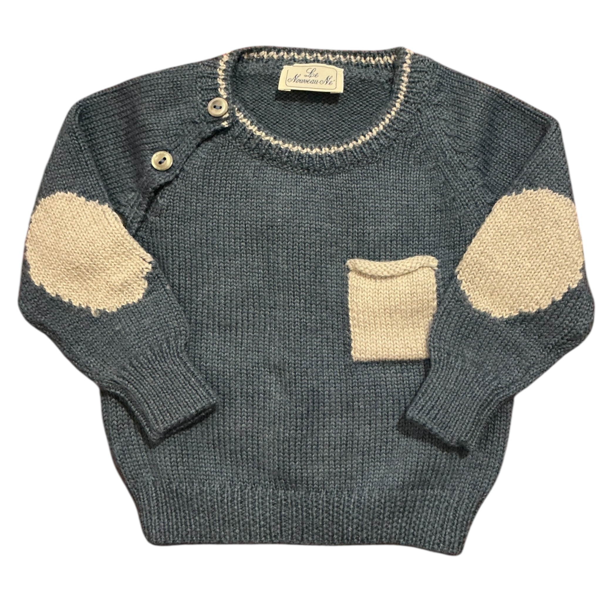 Golfino girocollo azzurro carta da zucchero con taschina e toppine in contrasto grigie Veramente delizioso, su può abbinare a dei body disponibili sul sito Seeds le nouveau né 100% lana vergine morbidissima